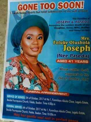 A Nigerian woman by name Abiodun Olayinka has narrated how a 41-year-old mother of 3, Late Mrs Foluke Olusola Joseph who died on October 2, 2017 in Ibadan, Oyo state was reportedly killed through witchcraft by her 11-year-old housemaid.